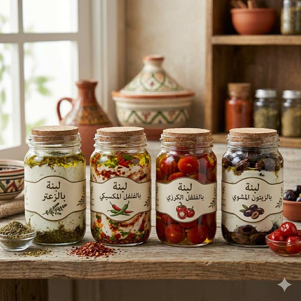 مرطبانات لبنة بالنكهات (زعتر \فلفل مكسيكي \ فلفل كرزي \ زيتون مشوي ) وزن 500 غرام بزيت الزيتون مجهز ومعبا بكل النكهات المرفقة ممكن عمل اكنر من نكهه معا صتاخة لمدة 6 اشهر